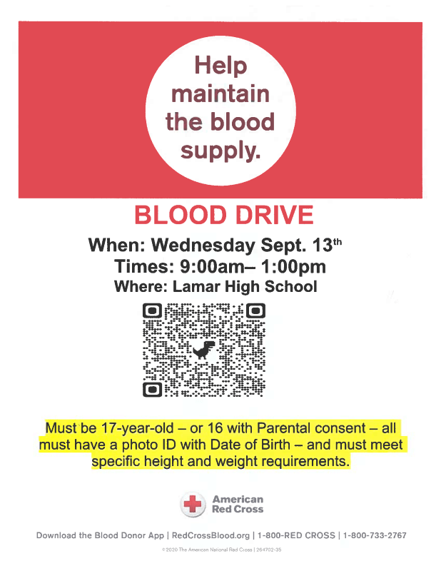 The American Red Cross will be at Lamar High School on March 11, 2024 for a Blood Drive.