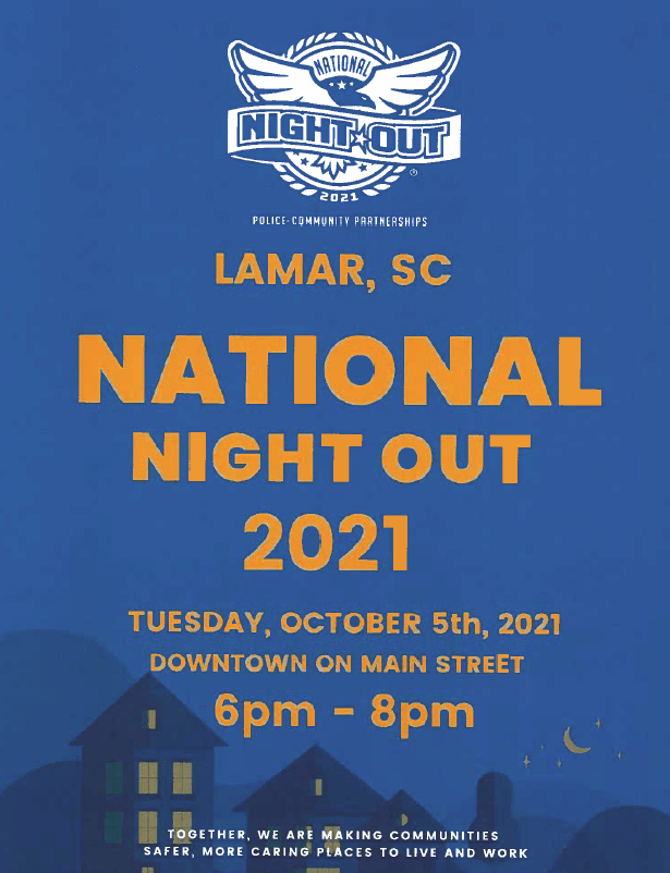 The Town of Lamar will host National Night Out downtown on Main Street, Tuesday, October 5, 2021 from 6 p.m. – 8 p.m.