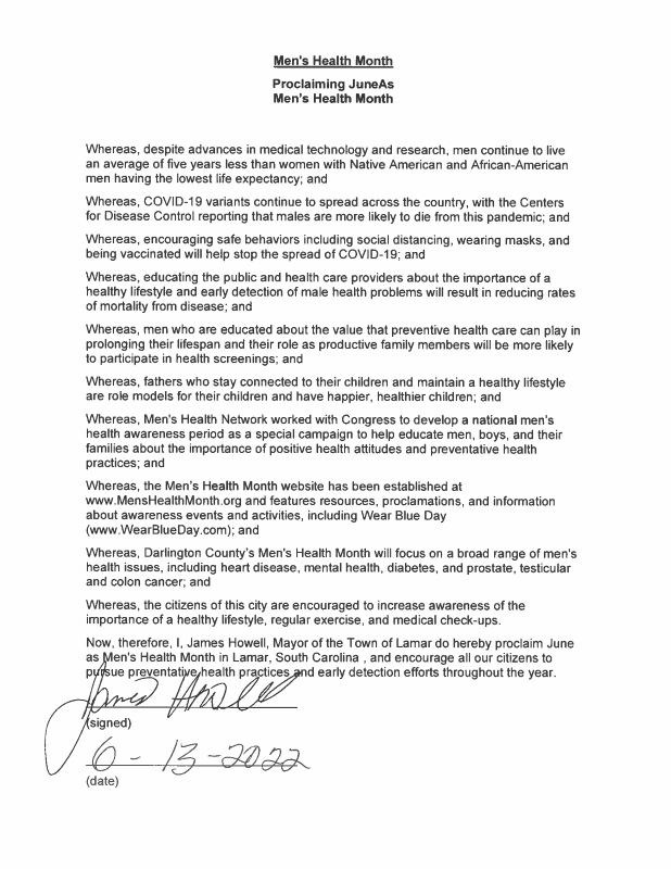 The Town of Lamar is proclaiming June as Men’s Health Month.
